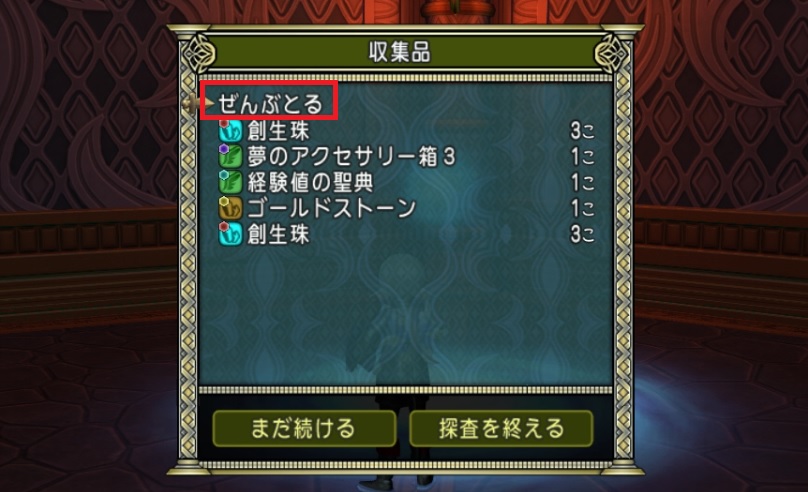 この時に各種アイテムが自動取得でないので、「ぜんぶとる」を選ばずに「探査を終える」を選んでしまうと獲得したアイテムが全て破棄されてしまうようです。