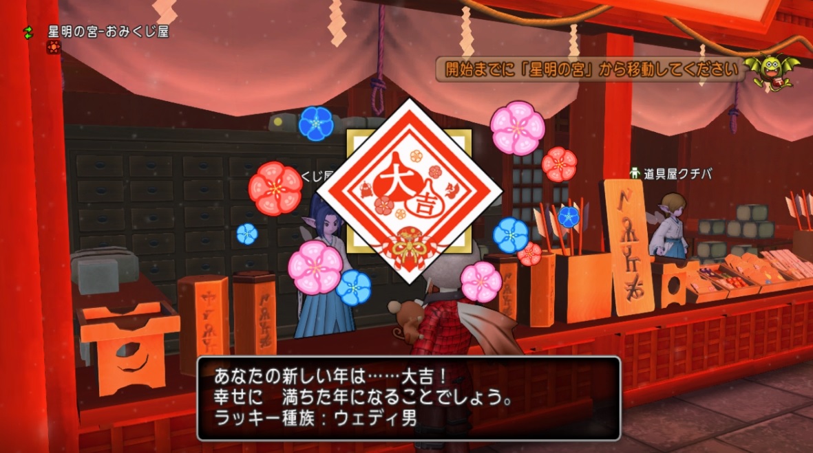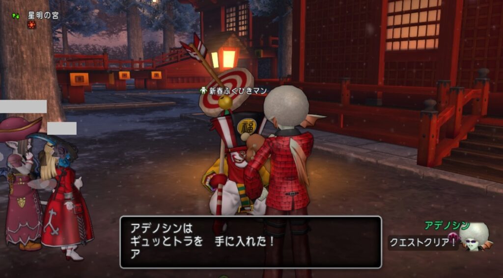 外に出て新春ふくびきマンに話しかければクエスト自体は終了です!