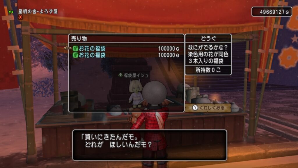 一つ10万Gとややお高いものの染色アイテムのガチャが出来る。購入は1回限りなので得するか損するかは己の運次第かな~。