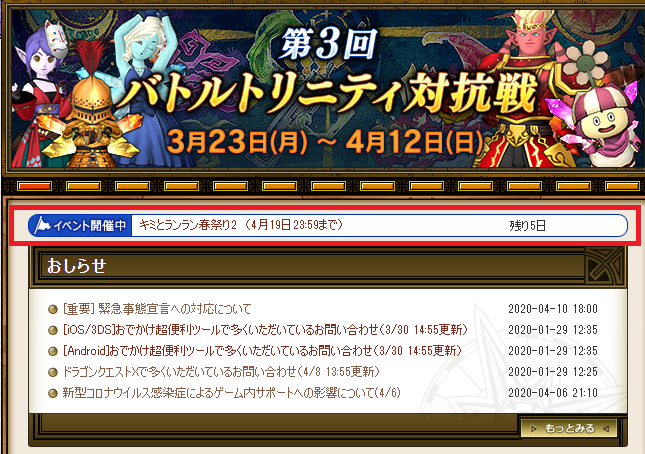 バトルトリニティ対抗戦がひっそりと終了したので、広場のイベント告知欄が寂しい。残りはキミとランラン春祭り2(19日まで)のみ。アップデートの延期が発表されてますので、これが終われば1カ月以上イベントがないという事に…。