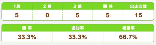 予選だと意外に善戦して勝ちを拾ってきてくれました。Sランクのマルゼンスキーに勝ったりもしてたので、作り込んだらもっと活躍できそう。